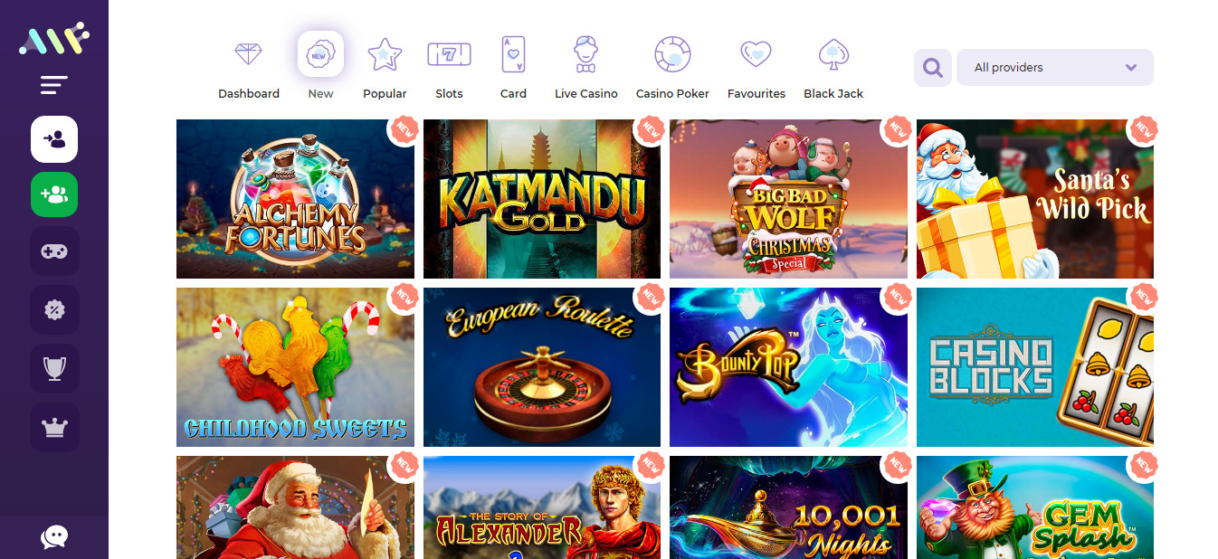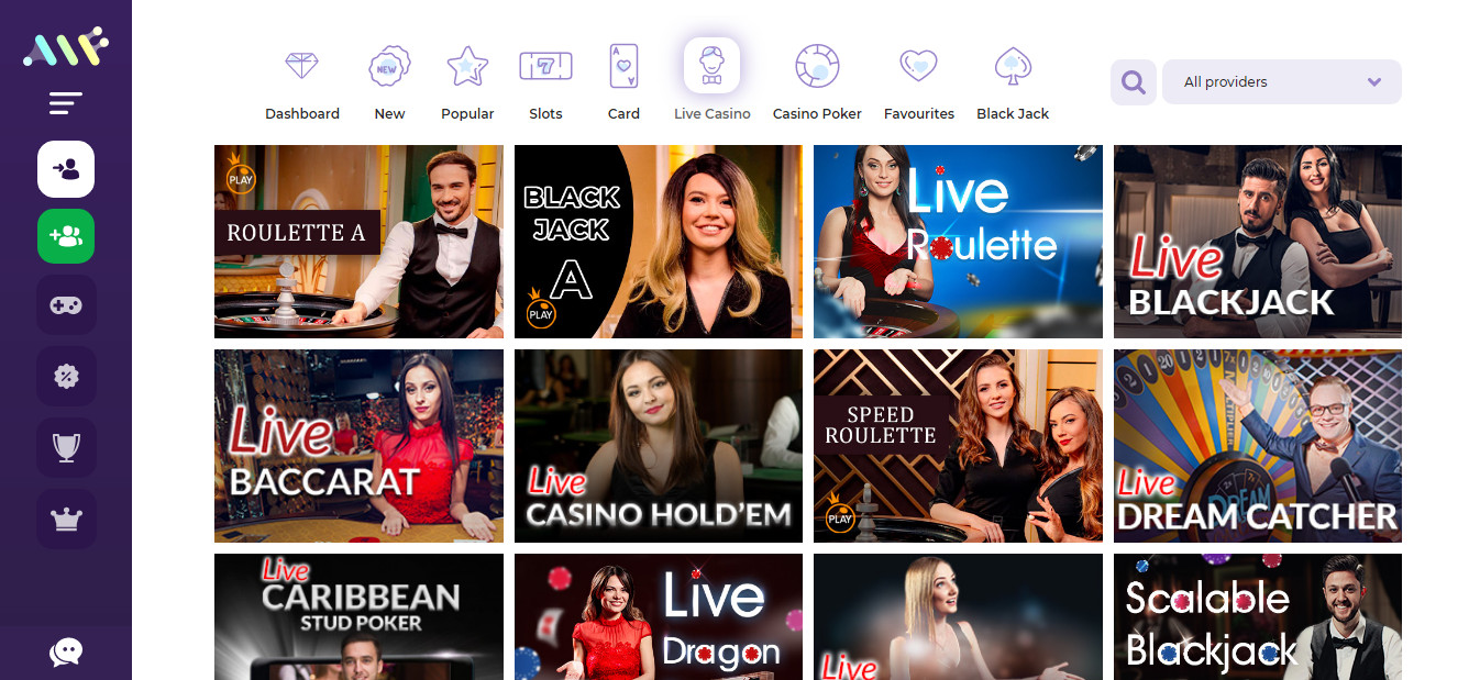 - Anbieter von Spielen 1x2 Gaming, Amatic, Betsoft, BGaming, Big Time Gaming, Booongo, Casino Technology, EGT, Elk Studios, Endorphina, Evolution Gaming, Ezugi, GameArt, Habanero, Igrosoft, Iron Dog, iSoftBet, Leap Gaming, Microgaming, NetEnt, Nolimit City, PariPlay, Play'n GO, Playson, Pragmatic Play, Push Gaming, Quickspin, Red Rake Gaming, Red Tiger Gaming, Relax, SA Gaming, Spinomenal, Tom Horn, Wazdan, Yggdrasil Gaming