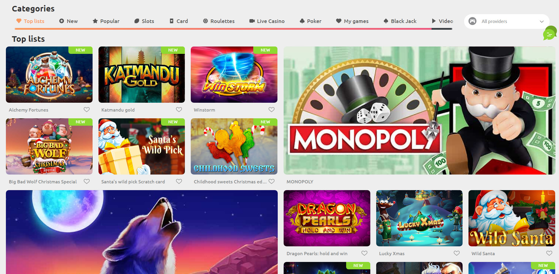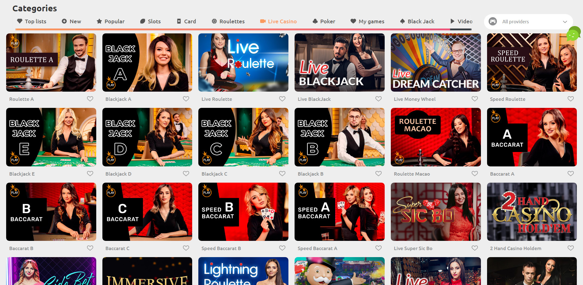 • Anbieter von Spielen 1x2 Gaming, Amatic, Betsoft, BF Games, BGaming, Big Time Gaming, Booongo, Casino Technology, EGT, Elk Studios, Endorphina, Evolution Gaming, Ezugi, GameArt, Habanero, Igrosoft, Iron Dog, iSoftBet, Leap Gaming, Microgaming, NetEnt, Nolimit City, PariPlay, PG Soft, Play'n GO, Playson, Pragmatic Play, Push Gaming, Quickspin, Red Rake Gaming, Red Tiger Gaming, Relax, SA Gaming, Spinomenal, Wazdan, Yggdrasil Gaming