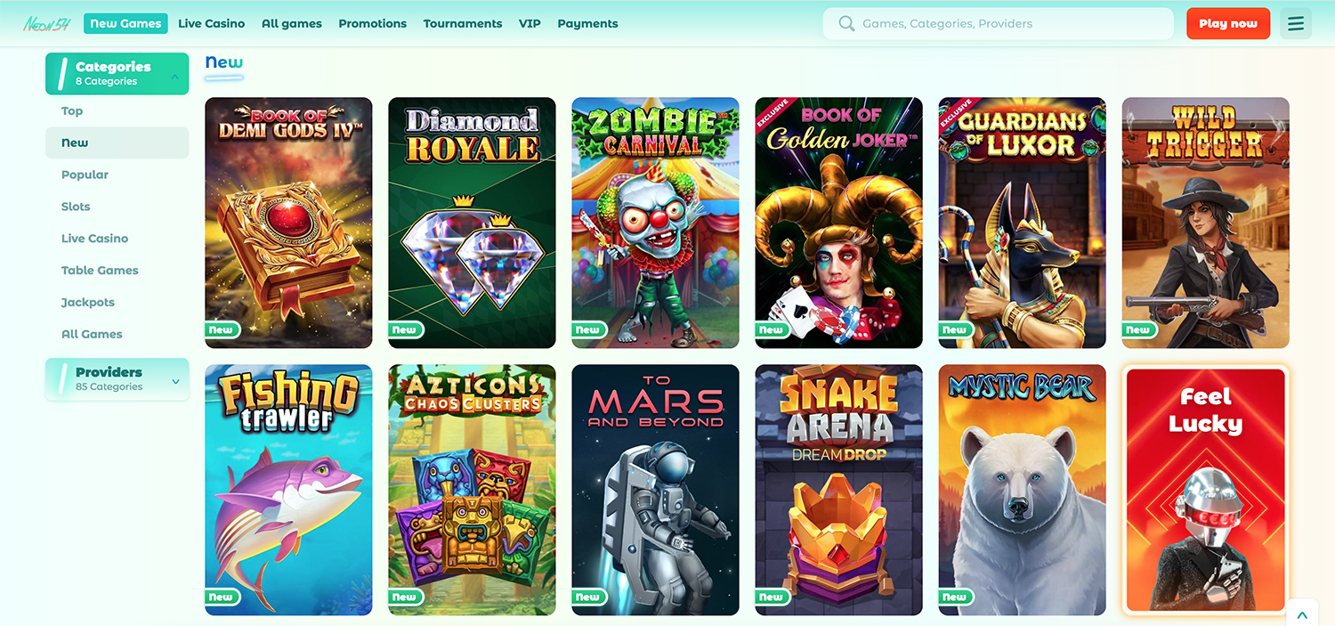- Leverantörer av spel 1x2 Gaming, 2 By 2 Gaming, BetGames, Betsoft, BF Games, BGaming, Big Time Gaming, Booongo, Caleta, EGT, Elk Studios, Endorphina, Evolution Gaming, Ezugi, Fantasma Games, Felix Gaming, Felt Gaming, Foxium, Fugaso, GameArt, Gamomat, Givme, Golden Hero, Golden Rock Studios, Habanero, Hacksaw Gaming, Hollywood TV, Iron Dog, iSoftBet, Just for The Win, Kiron, Leap Gaming, Mascot, Merkur, Microgaming, NetEnt, Nolimit City, OneTouch, Oryx, PariPlay, PG Soft, Platipus, Play'n GO, Playpearls, Playson, Playtech, Pragmatic Play, Push Gaming, Quickspin, Red Rake Gaming, Red Tiger Gaming, Relax, Spinomenal, Swintt, Thunderkick, Tom Horn, Wazdan, Yggdrasil Gaming
